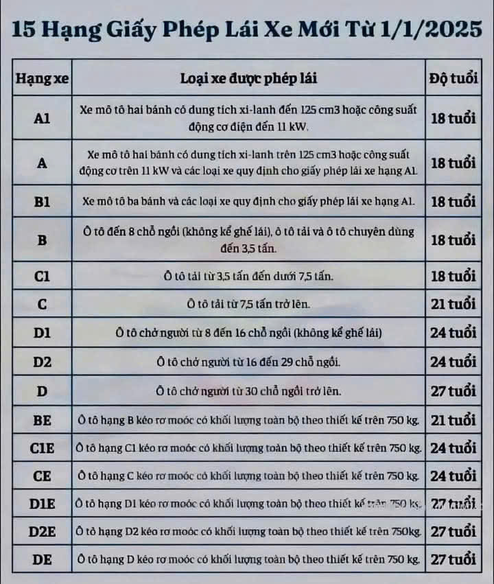 15 HẠNG GIẤY PHÉP LÁI XE MỚI TỪ 1/1/2025